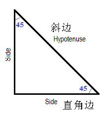 一个角为45度的直角三角形,就是等腰直角三角形,就是说它的另一个锐角也是45度,二条直角边是相等到的,若直角边长为1,则它的斜边长为√2,因此三条边的比为1:1:√2